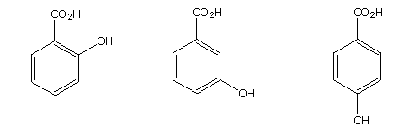 The three isomeric hydroxybenzoic acids are shown below. These compounds all have two acidic functions, the carboxylic acid and the phenolic hydroxyl group, Each compound will therefore have a pKa1 and a pKa2. The pKa of benzoic acid itself is 4.20. The pKa of phenol is10.00. Enter an estimated pKa for each of these in the designated answer box. The stronger acid should be pKa1. Answers will be judged correct if they are within 0.2 pKa units of the observed value.