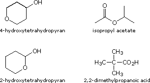 Four isomeric (C5H10O2) liquids are found in separate bottles with no labels. We shall refer to these unknowns as A, B, C, & D. These compounds are known to have the structures shown on the right. Each of these compounds is partially or completely soluble in water, and is also soluble in ether and methylene chloride. To discover which is which, three chemical tests may be applied to these unknowns: