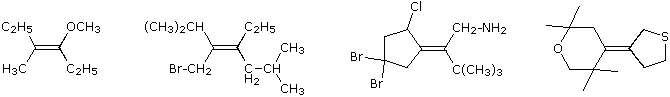 Structural formulas for four alkenes are shown below. All these compounds have two configurational sterioisomers that may be assigned E or Z identifying prefixes. At each end of each double bond you may click on the substituent that has the higher priority in the sequence rule. Eight such choices should be made, and a response to each choice will be given in an alert window. When you are ready, assign a configurational prefix, E or Z to each structure as drawn. Your answers will be evaluated in the window at the bottom of this page.
