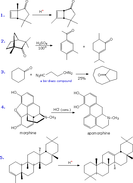 The following equations describe a series of molecular rearrangements. Consider each reaction in turn and try to write a mechanism for the transformation. By clicking on an equation a plausible mechanism for it will be drawn in the space on the right. Steps in which a skeletal rearrangement occurs are designated by magenta arrows.
