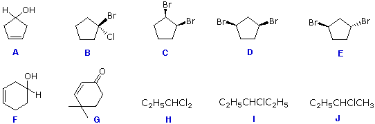 Examine structures A through J, shown below, with respect to their symmetry or lack of it. Assume that the five-membered rings and the ring in compound G are planar. The wedge-hatched bonds in B, C, D & E designate specific configurations. Also, for the acyclic compounds assume stable anti conformations. Answer each of the following questions by entering letters (A through L), corresponding to your selections, in each answer box. If there is no structure that fits the description enter an X in the answer box.