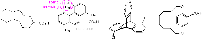 1. The following compounds exist as pairs of stereoisomers. Evaluate whether the structure is chiral or achiral and, if chiral, denote its nature (center, axis or plane). Select a compound by clicking the button beneath its structure, and then check the appropriate buttons regarding chirality.