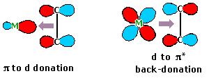 Zeise's salt is synthesized by reaction between K2PtCl4 and ethene, with a SnCl2 catalyst. It was one of the very first organometallic compounds to be prepared. The bonding of π-ligands to a transition metal is thought to be a synergic process involving donation of electrons from the filled π-orbital of the ligand into an empty d-orbital of the metal (a donor-acceptor bond), together with release (back donation) of electrons from an occupied d-orbital of the metal into the empty π*-antibonding orbital of the ligand. As a result, the bond order of the ligand is decreased, leading to an elongated C-C distance. This interaction also causes carbon atoms to "rehybridise" from sp2 towards sp3, which bends the hydrogen atoms on the ethylene away from the metal. An illustration of such bonding interactions is shown below.