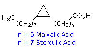 A wide array of unusual fatty acids is found in seed oils and microorganisms such as bacteria. Among these are fatty acids containing cis-cyclopropane fatty acids (e.g. lactobacillic acid), omega-cycloalkyl fatty acids (e.g. 2-hydroxy-11-cycloheptylundecanoic acid) and cyclopropene fatty acids (e.g. malvalic and sterculic acid).
