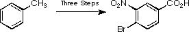 The transformation shown to the right can be accomplished in three steps. The methyl group can be oxidized to a carboxylic acid group, so two additional substituents need to be attached to the benzene ring. There are six possible combinations of these three steps, not all of which will lead to the desired compound. Consequently, it is important to combine them in an effective manner. The column on the left below outlines the kinds of reactions we may wish to consider for this synthesis. |